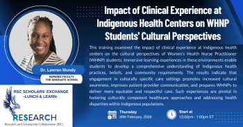 Grab some lunch and join the RSC for Dr. Lawren Mundy’s presentation: “Impact of Clinical Experience at Indigenous Health Centers on WHNP Students’ Cultural Perspectives.”